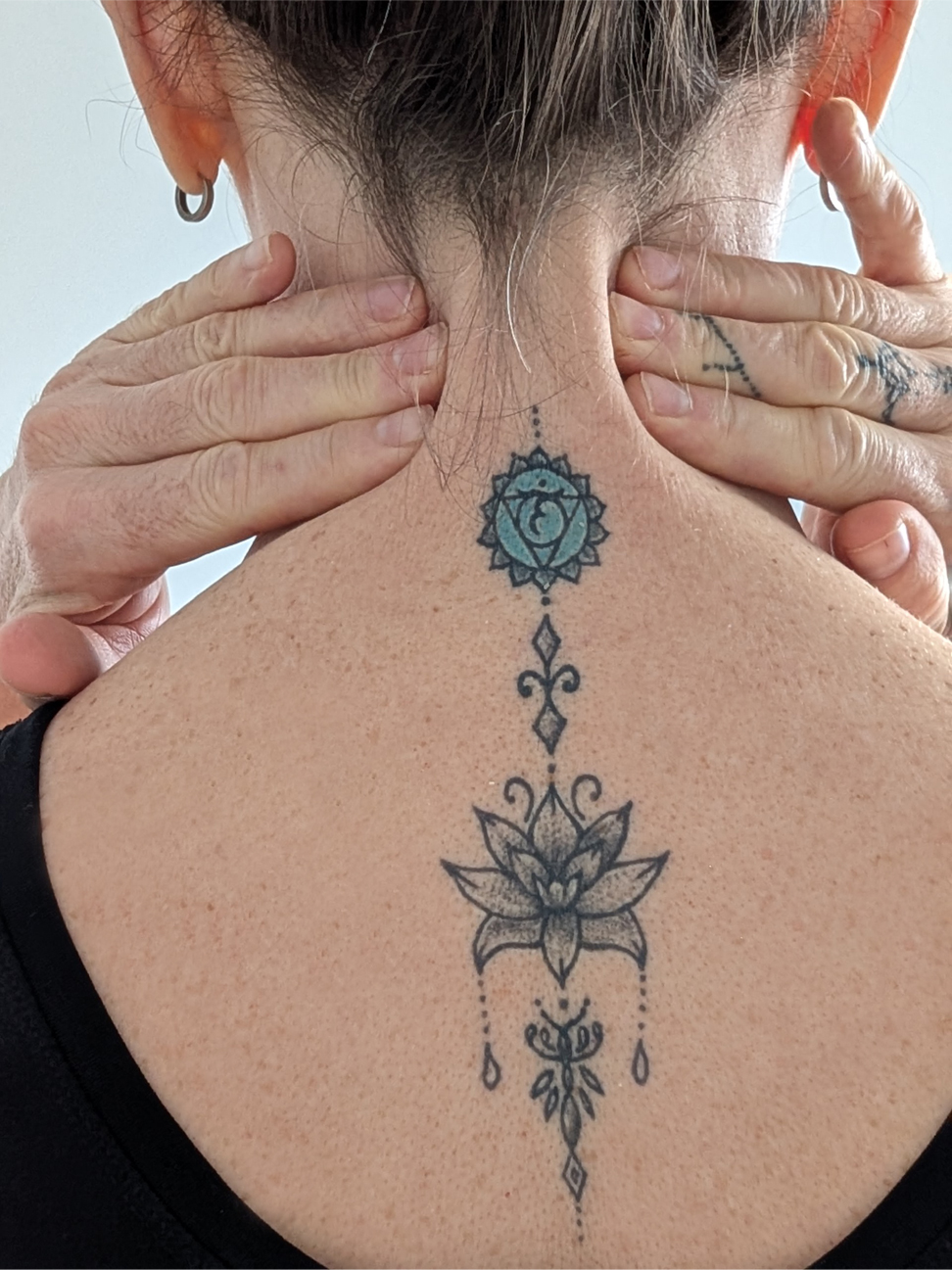 🤲 La nuque : Place tes deux mains derrière ta tête, pouces de chaque côté de la colonne. Fais de petits cercles lents en descendant du crâne vers les épaules. Respire. Répète 5-6 fois.